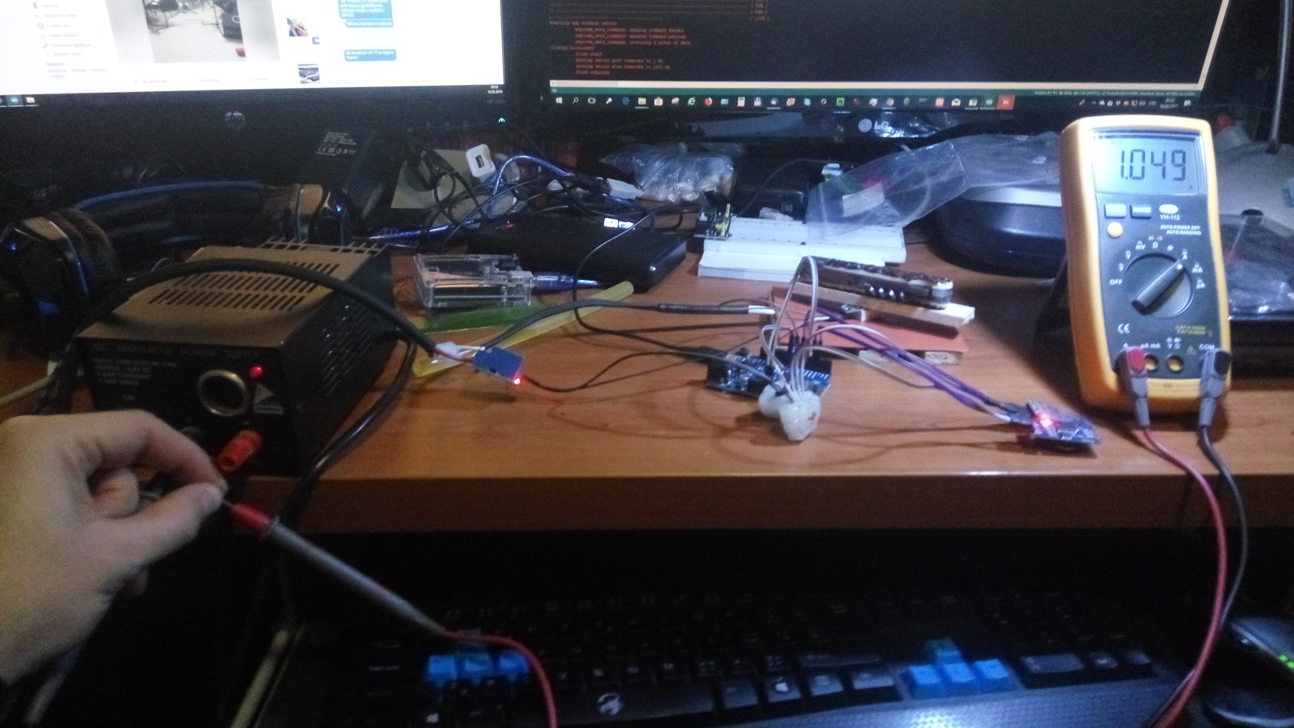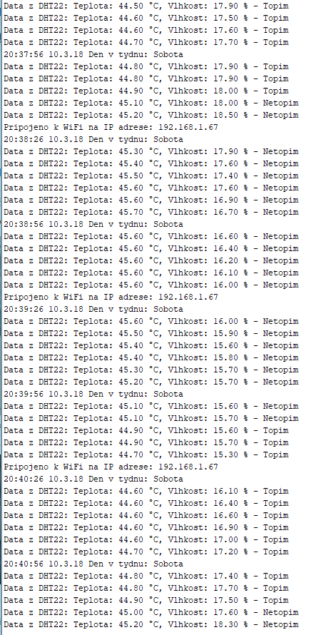 Mezní teplotu jsme nastavili na 45°C – pokud poklesne pod tuto hranici, relé sepne topení, pokud bude nad touto hranicí, topení se vypne. Měření teploty bylo nastaveno v intervalu 5 sekund. Naměřené hodnoty byly vypisovány po seriové lince (čtečka SD karty, na kterou se data budou zapisovat, také ještě nedorazila).